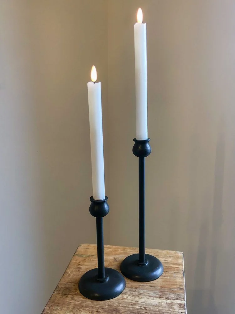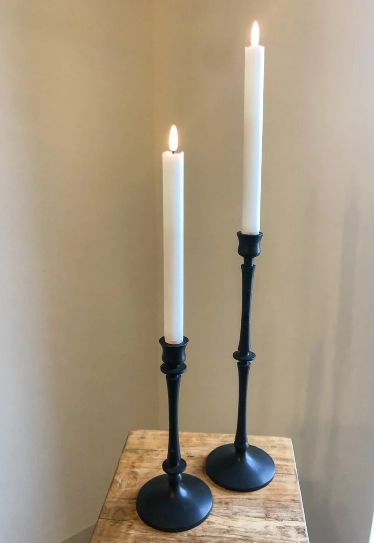 Black taper candle holders. 23 units available across 2 sizes. Holds a standard 7/8” taper candle. Must use LED candle—no real flame! Our wax LED candles (pictured) are available for an additional rental fee.