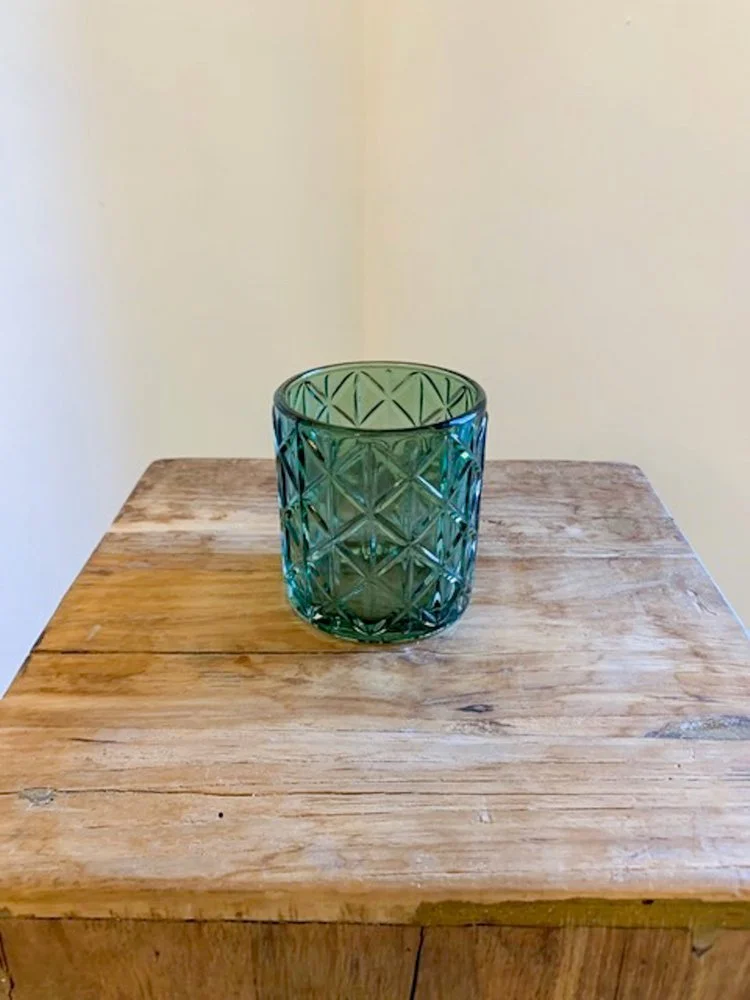 Green votive candle holders with diamond detailing.