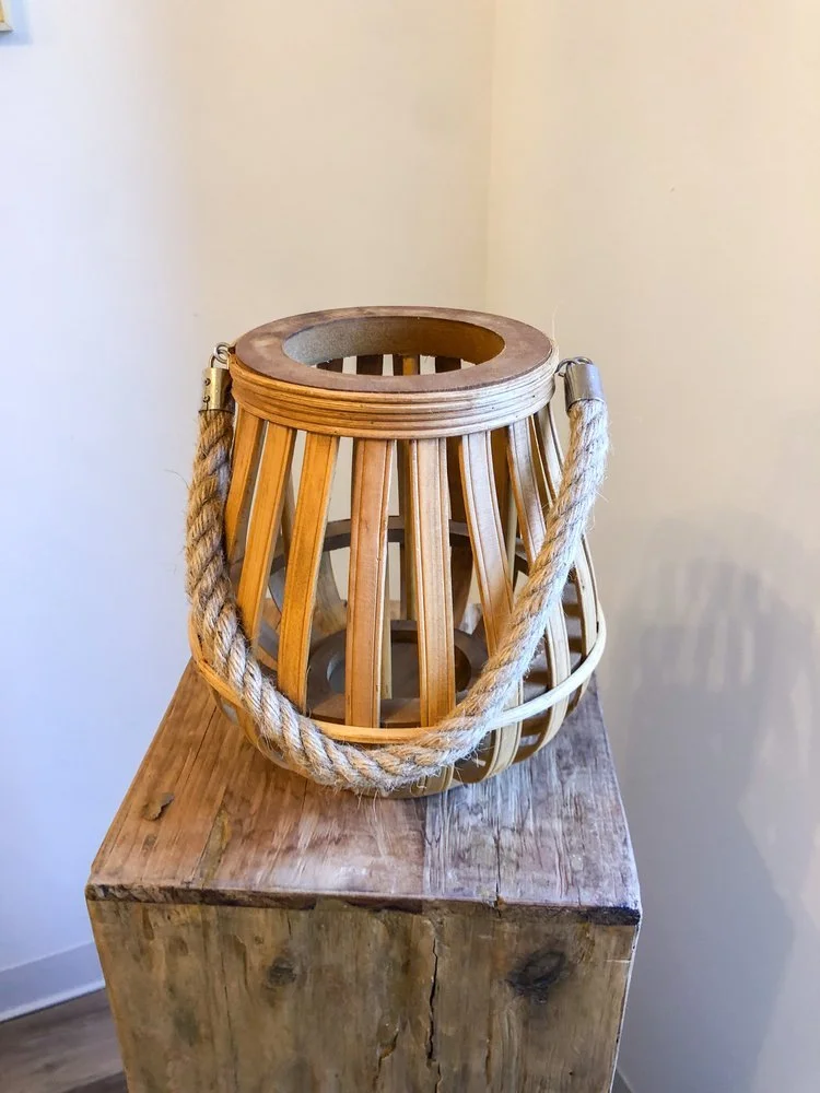 Wooden pillar candle holder with rope handle. Great for lining walkways. 6 units available (all the same size).Must use LED candle—no real flame! Our wax LED candles are available for an additional rental fee.